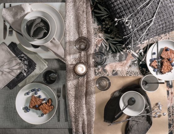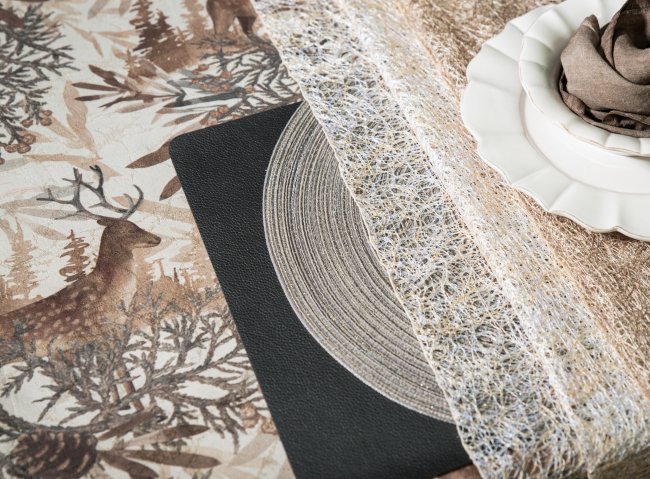 Holzscheite knistern im Kamin, Kerzenflammen flackern am festlich gedeckten Tisch: „Cosy Elegance“ verwandelt das Wohn- und Esszimmer in ein gemütliches Chalet. Auf Läufern und Kissenhüllen thronen majestätische Hirsche auf glanzdurchwebtem Jacquard. Ein leiser Lüster schimmert auf Winterwald-Dessins in Champagner, Silber, Grey, Taupe und Bronce. Der kontrastreiche Materialmix paart Glanzpunkte wie goldfarbene Spitze und Tischsets in Metallic-Optik mit haptisch einzigartigen und außergewöhnlich weichen Kissen. Willkommen im Winterwunderland.