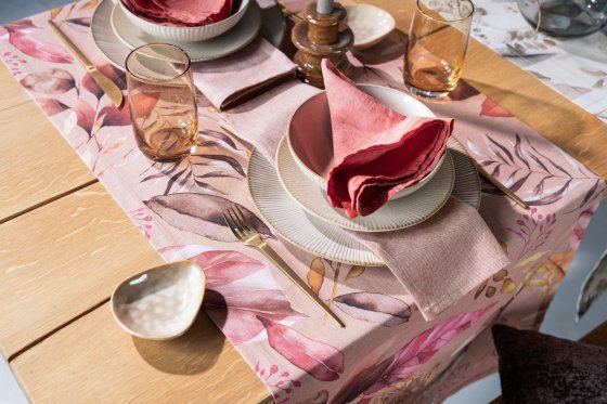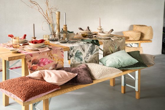 Als hätte die Natur ihre schönsten Aquarellfarben ausgepackt, taucht Looks Like Nature den Esstisch in ein zauberhaftes Farbspektakel. Die Pracht des herbstlichen Waldes macht Appetit – mal in Koralle mit Pink, mal in sanften Grau-Grün-Nuancen oder geheimnisvoll in erdigen Humus-Tönen mit Olive. Dazu laden Kissen verschiedener Materialien und Strukturen zum gemütlichen Beisammensein ein. Hier wird jeder Augenblick zur Auszeit – denn der Herbst verleiht Alltag und Festtagen die schönsten Farbtupfer.